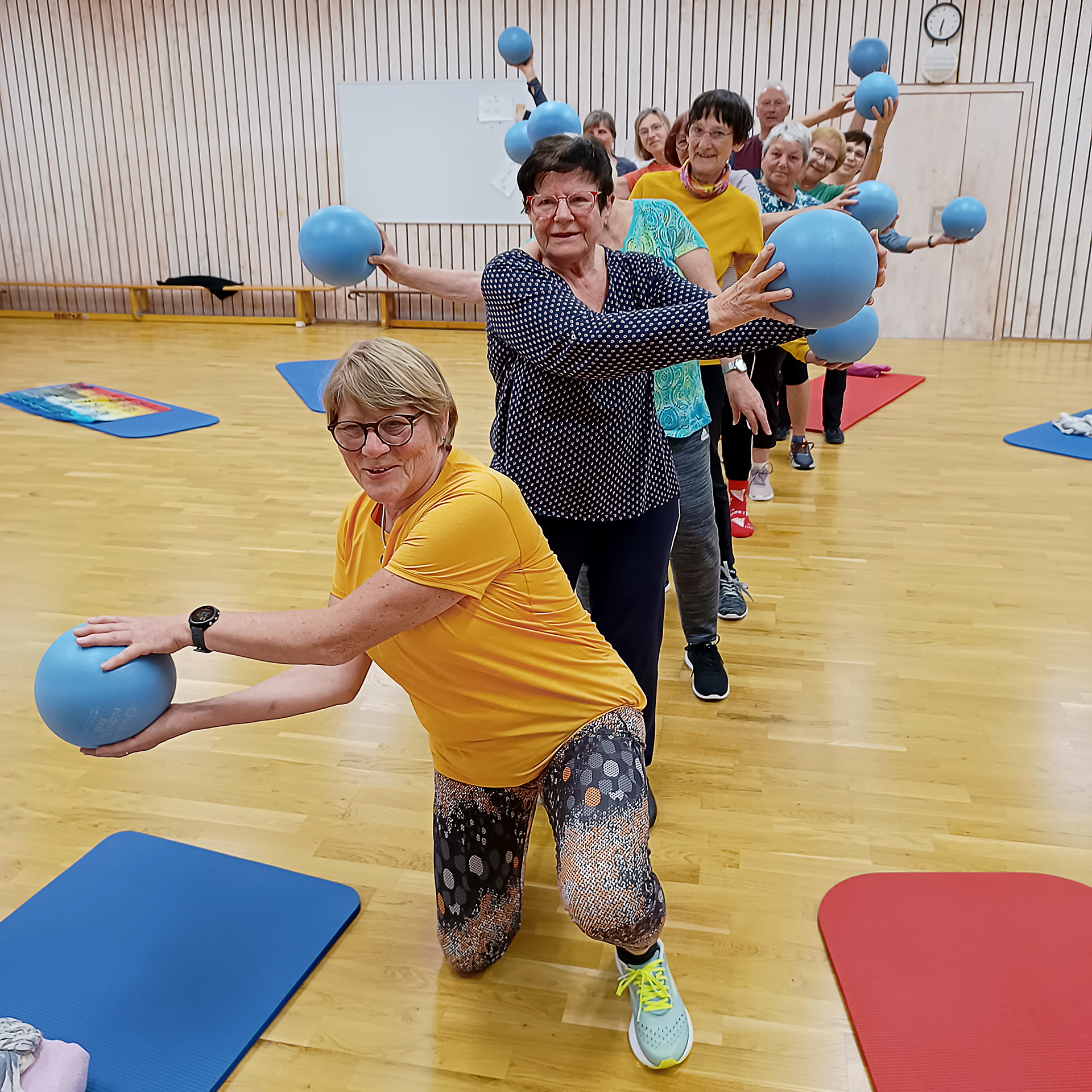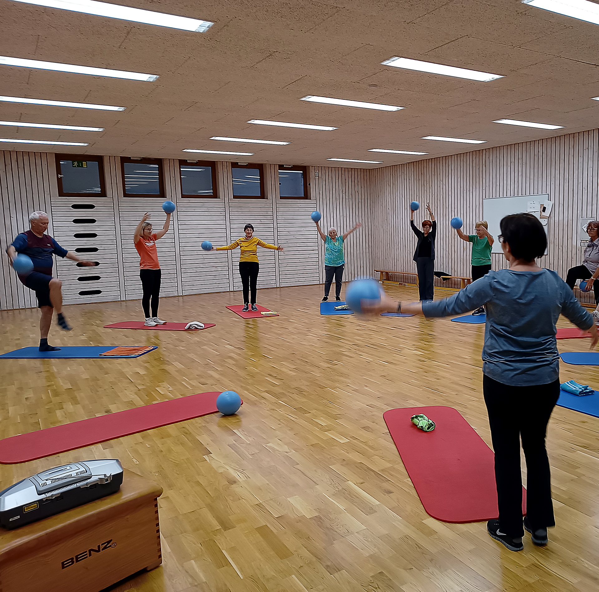 Eine gemischte Gruppe aus Männer und Frauen ab ca. 50 Jahren. Bequeme Sportkleidung, leichte Turnschuhe oder Stoppersocken/Gymnastikschläppchen. Ein Handtuch sollte mitgebracht werden.