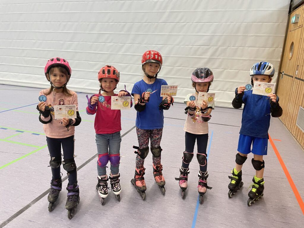 Lilly, Sarah, Josephine, Lena und Eray (v.l.n.r.): sie haben das erste Skateabzeichen geschafft! Gratulation! Dazu mussten sie ohne zu stürzen rückwärts und 5 Minuten ununterbrochen skaten. Ein Parcours der aus einem Slalom, einem kleinen Sprung, dem Fahren in tiefer Position und dem zügigen Bewältigen eines Kreises besteht, muss in gerade mal in 22 Sekunden zu durchlaufen sein. Vor allem der Parcours hatte es in sich. Aber auch hier gilt: Übung macht den Meister! Und ganz klar, diese 5 jungen Sportler sind der ersten Gruppe entwachsen und dürfen bald in die Gruppe 2 aufsteigen!